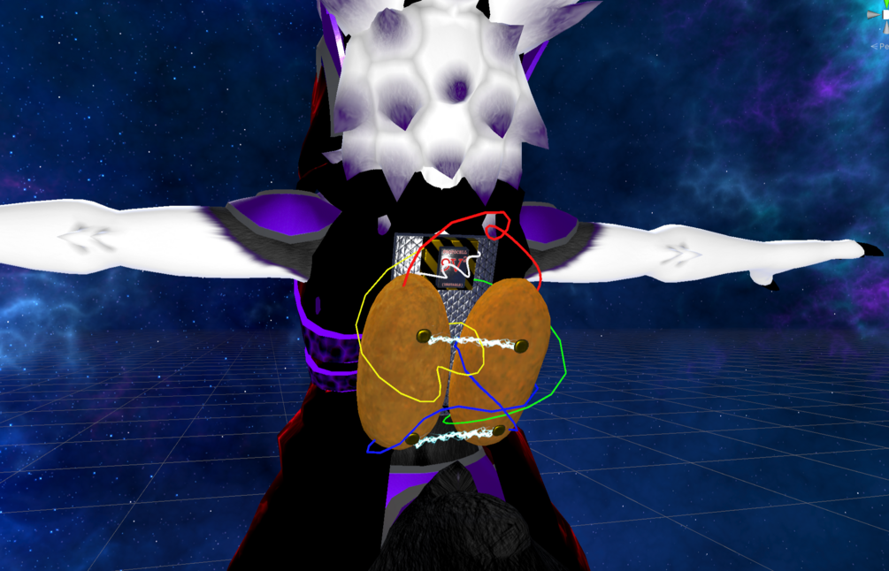 - Full Model, 3 Material calls (2 for Electric Flipbook effects), 5685 Polys, Electric Flipbook effect, 4 low cost particle effects totalling 57 total particles (for reference, VRChat allows 2500 for good quality)